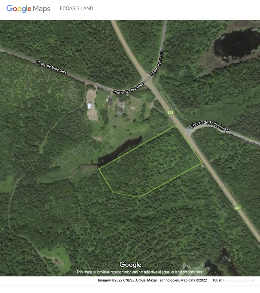 The parcel of land we possess for the future use of our housing project, falls within the Mille-Isles Municipality of Quebec Canada, and is located at the intersection of the 329 highway and Chemin de Mille Isles. The site is approximately an hour and a half away from Montreal and 30 minutes away from Saint-Jerome; the nearest town with social services, community centers and infrastructure.